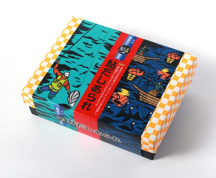 世界農業遺産に登録された「清流長良川の鮎」の出汁を使った弊社の鮎だししょうゆで味付けをした、鮎だしあられです。 パッケージには長良川の鵜飼と鮎釣りのイメージでデザインしています。 岐阜県の魅力がいっぱい詰まった商品に仕上がりました。県外の方への手土産にいかがでしょうか?